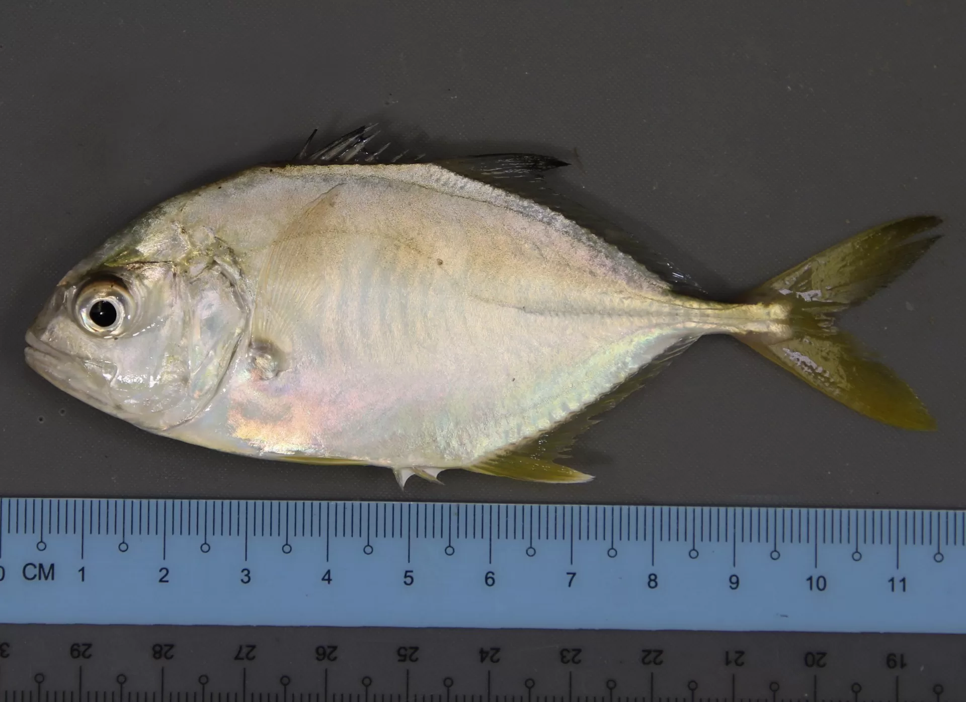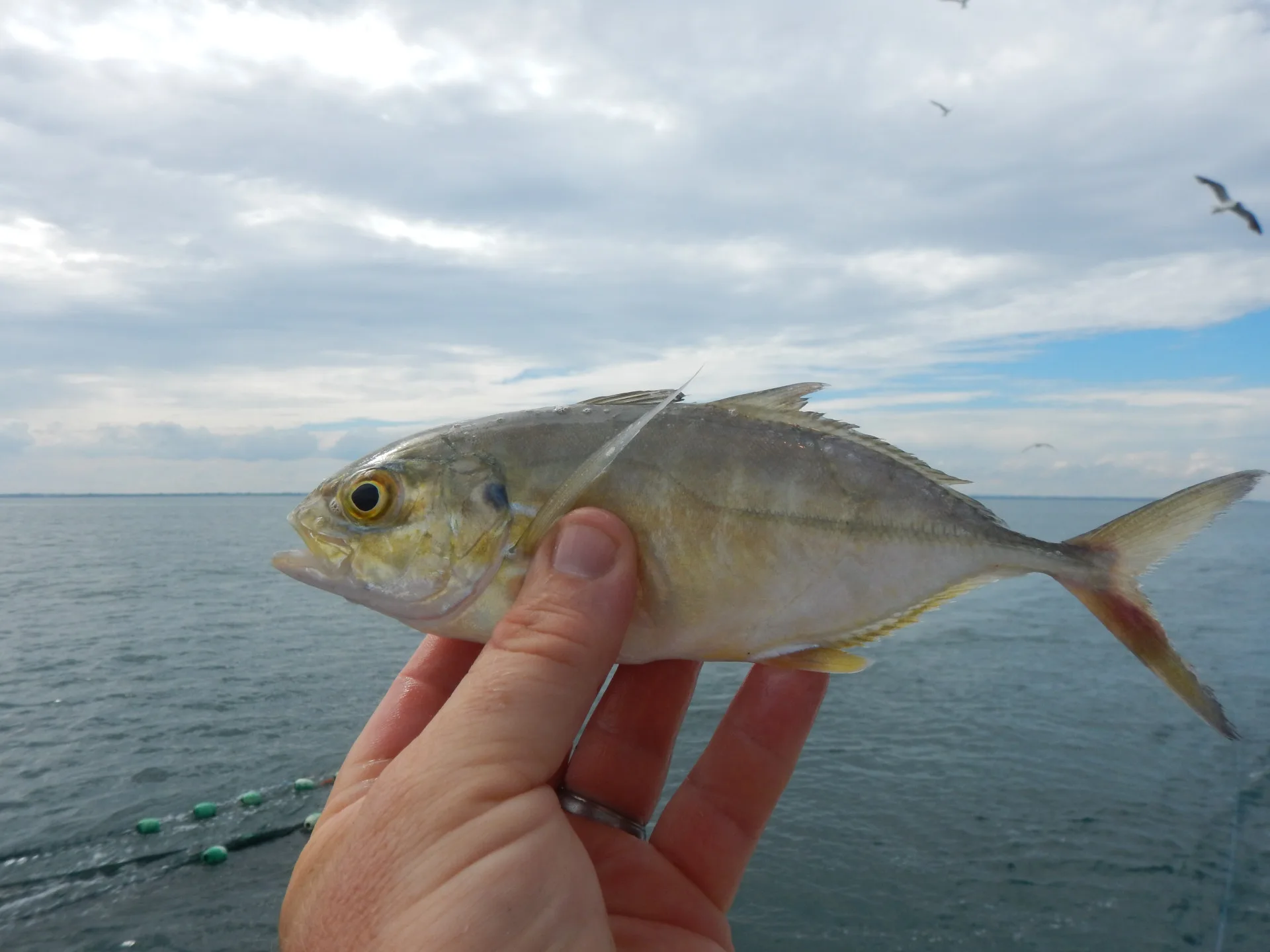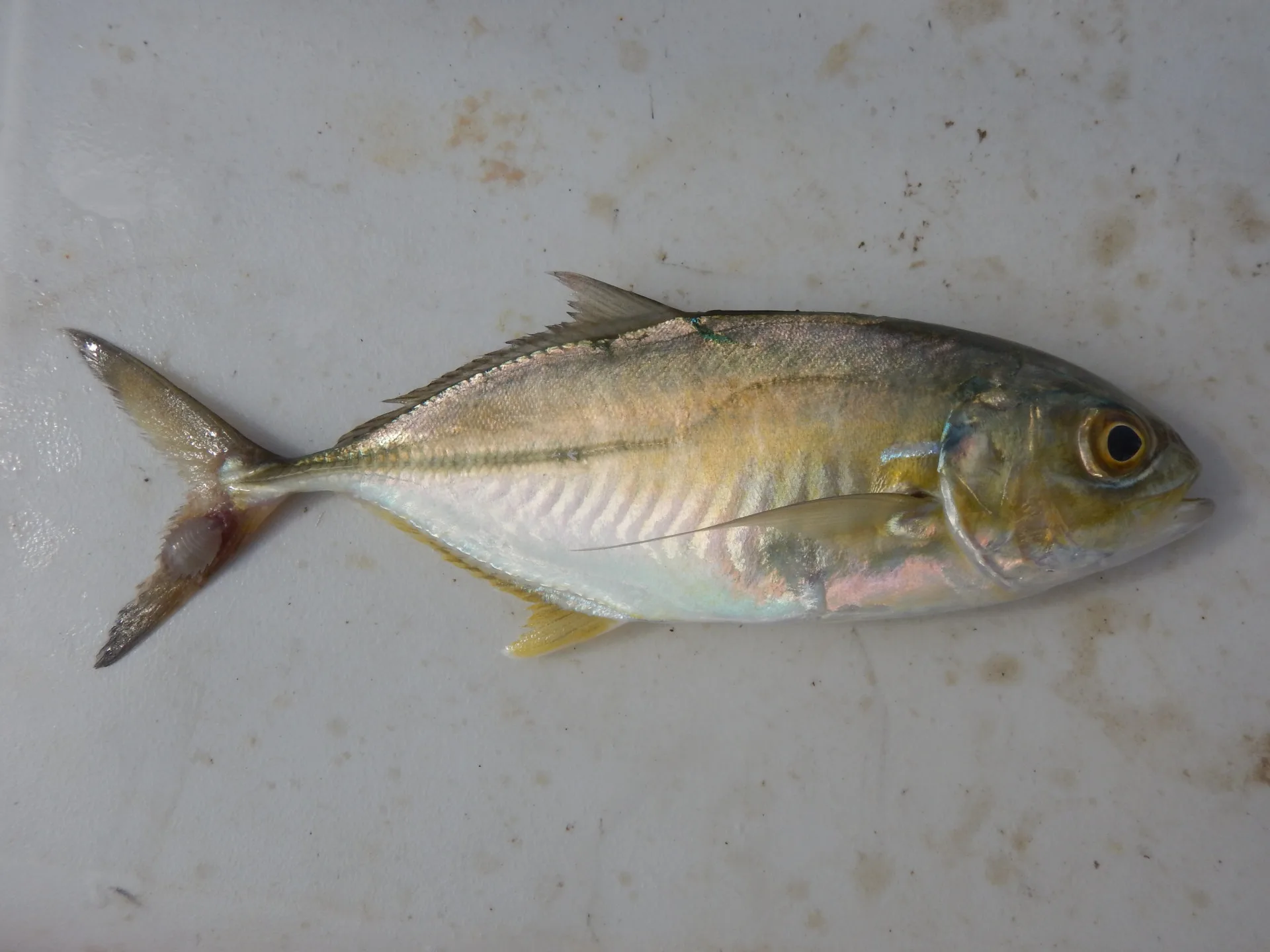 Juvenile Crevalle Jack can be distinguished from juvenile Bluefish by the presence of approximately 5 broad vertical dark bars on the sides of the body.